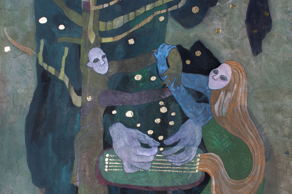 Väinämöinen luo uuden kanteleen / Väinämöinen creates a new music instrument kantele 万纳摩宁创造乐器坎特勒琴 ink and foil on rice paper,