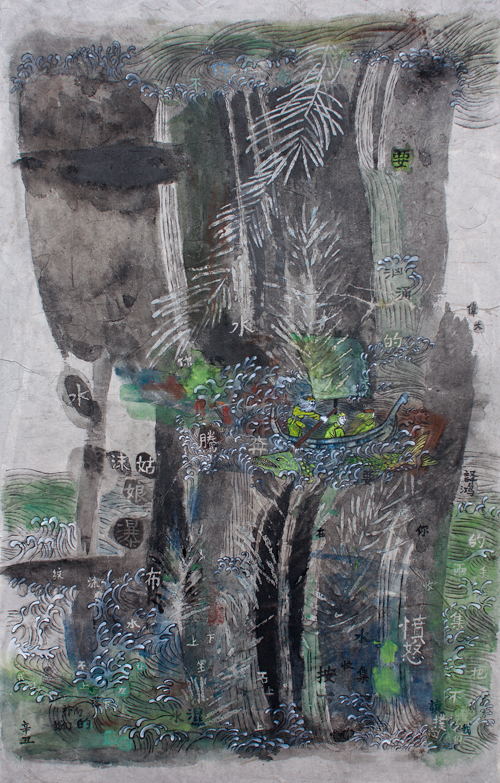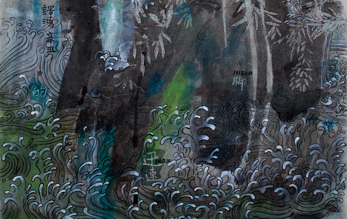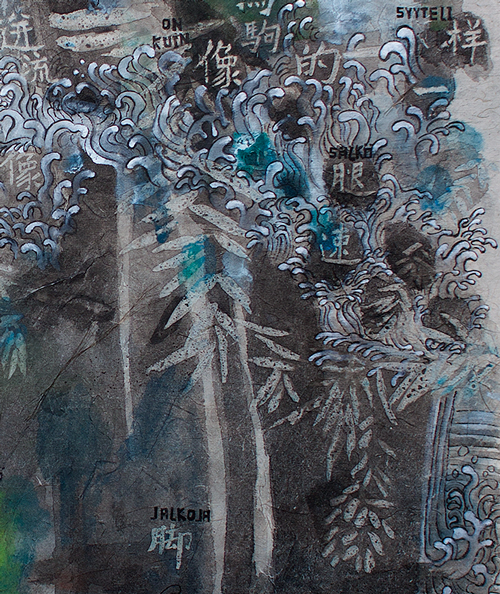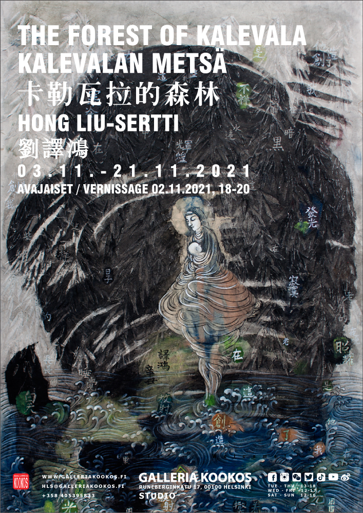 My paintings in the series exhibition The Forest of Kalevala – Kalevan Metsä are based on traditional Chinese calligraphy and combine image and poem. The text of the epic in the painting is deconstructed, and the viewer can reconstruct the new poem from the old one.