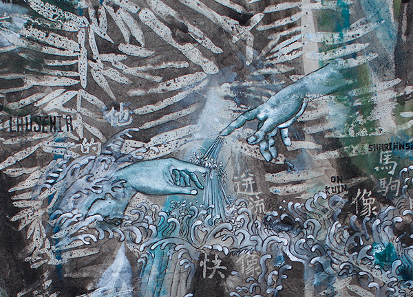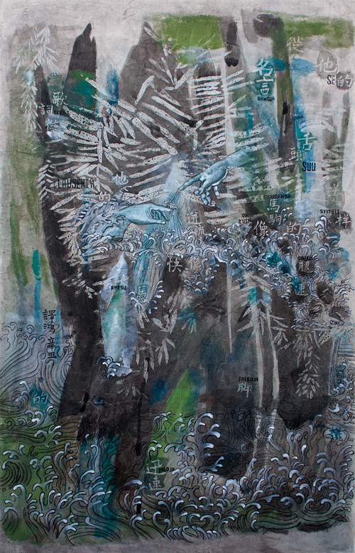 Kalligrafiamerkit järjestellään uudelleen, jolloin vanhoista säkeistä rakentuu uusi runo. Maalaukseni kuvaavat ylikansallisten identiteettien muodostumista ihmisen ja luonnon yhteyteen ja ajattomuuden teemaan.